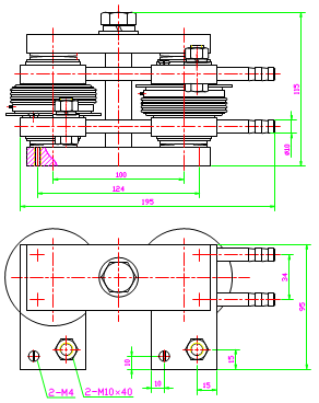 主要技術參數:該組件的通流能力及斷態耐 壓,決定于所選用的晶閘管及水冷散熱器。例如:下圖所示由兩只KP800-16晶閘管及水冷散熱器組成的組件,技術參數為: